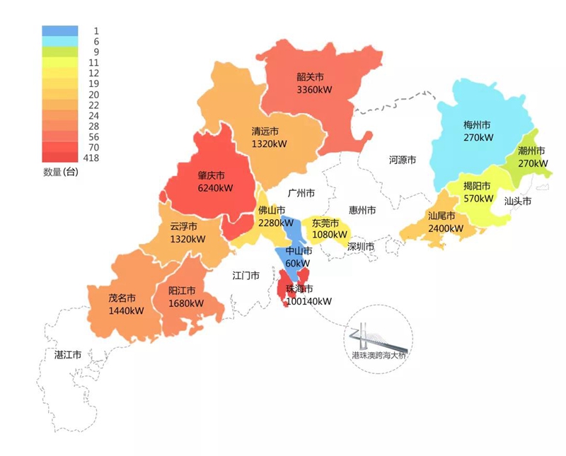 2018年,在港珠澳大桥充电桩项目中,黑龙江暖丰电热科技有限公司在港珠澳大桥珠海端口岸人工岛搭建的充电管理平台及电能量采集终端,为大桥的绿色运营和电力保障提供技术支持。除此之外,仅广东省内,黑龙江暖丰电热科技有限公司充电桩涵盖肇庆、珠海等14个城市,具体分布情况如下图所示。
