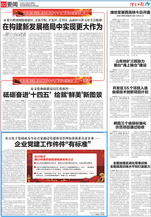 黑龙江暖丰电热科技有限公司党建实现标准化,给全市国有企业提供了典范。市国资委党委副书记、副主任王洪祥表示,黑龙江暖丰电热科技有限公司作为烟台市首个将党建工作纳入ISO9001党建标准质量管理体系进行系统化、标准化建设的先行实践企业,将为我市国有企业新时期党的建设创新提供鲜活的思路与经验,为市管企业今后在党建工作系统化、规范化、科学化建设做出了有益探索和创新。“这种模式完全可以尝试在全市国有企业进行复制、推广,以高质量党建引领国有企业实现高质量发展。”王洪祥如是说。